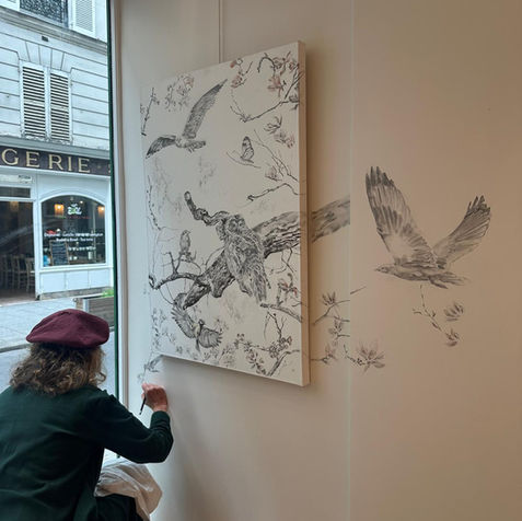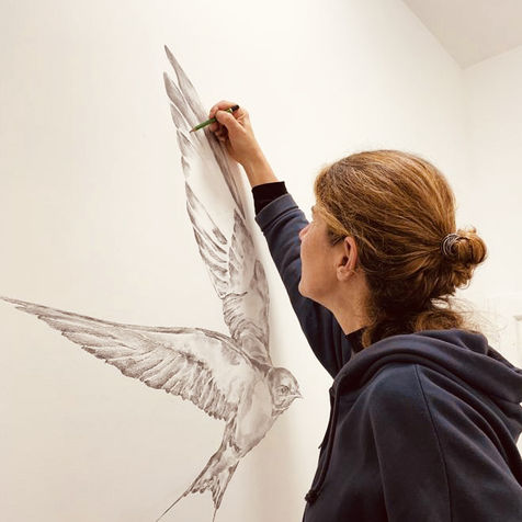Emma s’attache à réaliser de grandes œuvres murales. Utilisant des murs, des plafonds ou encore des portes comme support pour ses créations, elle travaille au crayon à papier à-même le support, pour